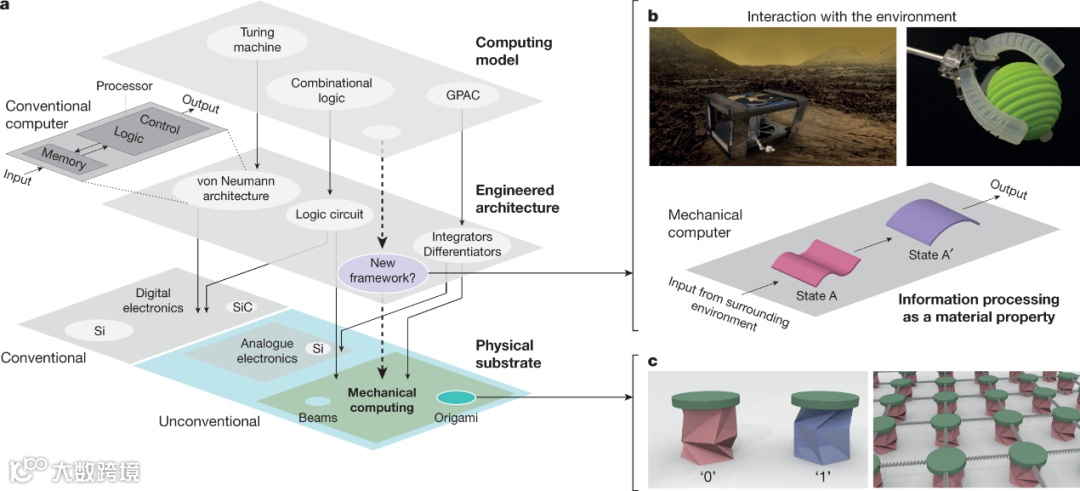 近日,美国宾夕法尼亚大学机械工程与应用力学系Jordan R. Raney教授团队研究了一些案例,专注于使用机械机制作为处理信息的手段的新兴研究,由于增材制造、材料科学和结构工程的进步,这一概念变得合理。与古代机械计算机的齿轮和连杆不同,这些新的机械计算系统使用各种微妙的机制来感知、交互和处理来自环境的信息。通过这种方式,信息处理可以被视为一种材料特性,与传统材料属性(如强度和刚度)一样。然而,由于信息处理本质上是构成和几何的一部分,因此需要超越传统冯诺依曼架构的新设计规则和计算技术。从这个角度来看,团队使用三层计算框架来概述计算系统中信息抽象的过程,并突出每一层机械计算的创新。使用组合逻辑作为指导性计算模型,首先考虑物理基板层中机械二进制数字(位)的抽象,突出显示静态和动态表示。接下来,考虑如何将上述机制组合或联网以实现更复杂的计算并可能实现特定的工程架构。然后考虑这些系统如何与周围环境和/或其他子系统交互(输入/输出),以及与传统计算方法相比的优势。最后,总结了即将到来的挑战和机遇以及未来更广泛的社区参与的机遇。相关研究发表在《Nature》上。(徐锐)