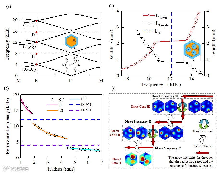 兴起于电子系统的拓扑边缘态,具有受拓扑保护且背散射抑制的单向能量传播特性,成为凝聚体物理领域的热门研究课题。近年来,关于电子系统拓扑保护边缘态的进展启发了声学系统中声边缘态的研究,其中声谷霍尔边缘态由于其相关联的晶格结构对称性具有设计灵活的特点,获得越来越多的关注。然而,多频带的声拓扑态研究受限于结构尺寸,而不能得到快速发展。另外,目前的边缘态所关联的体带隙主要与Bragg散射有关,而散射体自身的共振特性(局域共振)也可以实现体带隙,因此结合两种带隙机理有望实现频带范围可设计的多频带声谷边缘态。