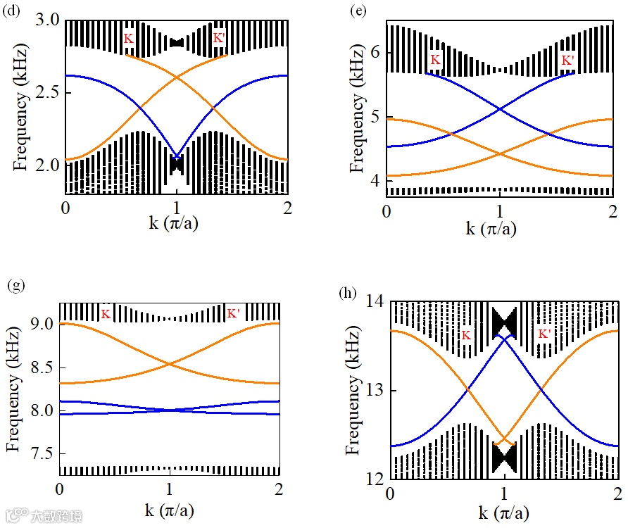 随后,作者构造了一种包含两种晶格对称性(C3v)的结构,结构参数的获取来源于对两种带隙机理耦合特性的分析。如图2所示,可以得到频率范围可调的四个边界态带隙,其中第一带隙形成主要来源于局域共振的影响,第四带隙的形成中Bragg散射起着主导性作用,而第二带隙和第三带隙的形成是局域共振和Bragg散射共同作用的结果。基于两种带隙机理对狄拉克点频率的影响规律,实现了多频带的声拓扑谷边缘态的传输。