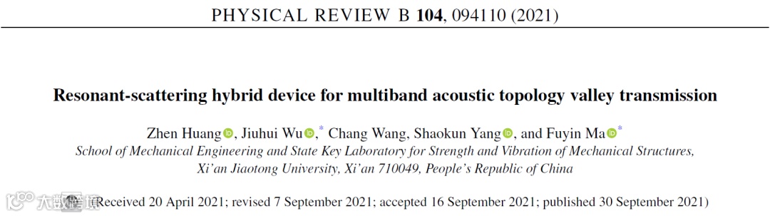 相关研究成果以“用于多频带声拓扑谷传输的谐振-散射混合器件”(Resonant-scattering hybrid device for multiband acoustic topology valley transmission)为题,发表在《Physical Review B》[Phys. Rev. B 104, 094110, 2021]上。西安交通大学为第一作者单位和唯一通讯单位,机械学院博士生黄镇为第一作者,吴九汇教授和马富银副教授为共同通讯作者。