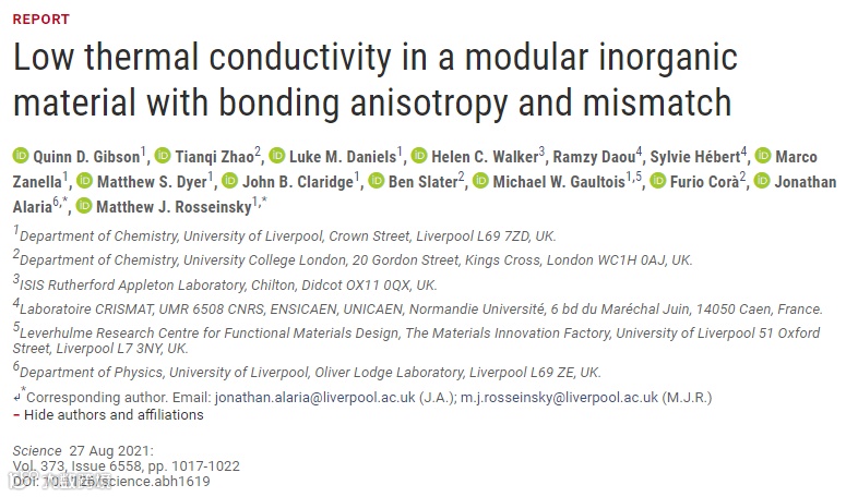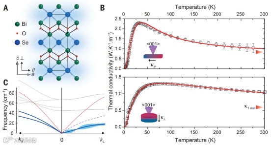晶格导热系数(k)是所有固体固有的本征性质,其具有重要的技术影响,推动了材料设计领域并且最大限度地提高导热材料导热范围的探索热情。目前,导热系数低于日常隔热用石英玻璃(0.9W K−1m−1)的材料特别受关注。自从爱因斯坦的理论著作发表以来,人们一直在研究k的下限。热物理认为在低k时会出现材料的本质上的变化,在这个领域中出现了许多新的机制。对新材料的研究使我们能够更好地理解以前未曾探索过的原子排列和k上出现的成键模式。晶体材料的热导率有一个最低限度,因为其热导率的本征极限取决于声子色散(phonon dispersion)。