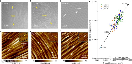 使用AFM来研究石墨烯薄膜的形态。在1,320 K和1,170 K下生长的石墨烯薄膜的AFM图像中观察到折叠(图2d和人e),但在1,030 K下生长的任何薄膜中均未观察到折叠(图2f)。在所有三种石墨烯薄膜中都观察到平行波纹,对于三种生长温度,波纹的平均高度(1.3 nm)和平均间距(1.1 μm)都非常相似。因此,波纹形成所释放的局部应力是相似的。拉曼光谱用于研究未脱附区域的压缩应变,因为G和2D波段的频移对其应变敏感。这三种石墨烯薄膜G波段频率拉曼成像(图2g)的对比非常相似,表明它们处于0.15%至0.25%的相似压缩应变下(即石墨烯中的压缩应力在约1.5 GPa和2.5 GPa之间)。因此,当合金箔从生长温度冷却到1,030 K时,界面压应力的完全释放会形成石墨烯折叠,进一步冷却到室温会产生压缩应变为0.15-0.25%的石墨烯,平行波纹贡献约0.24%的收缩。