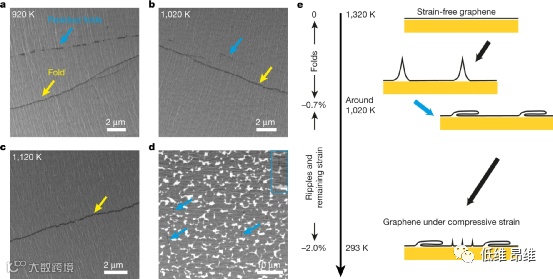 为了研究残余折叠的起源,进行了几个对照实验。可以发现:(1)无法通过将Cu(111)箔衬底上的石墨烯薄膜从室温重新加热到高温(例如1,320 K)来松开形成的石墨烯折叠;(2)由于H2的存在,当从生长温度冷却并稳定在1,020 K时,会发生单层和折叠区域的刻蚀(图1d),产生具有残余折叠的非连续石墨烯薄膜;(3)在循环实验中,当刻蚀的薄膜被重新加热到1,320 K时,石墨烯在刻蚀区域重新生长形成完整的薄膜,在某些区域有残余折叠的迹象,并且在最后的冷却步骤中形成了新的平行长折叠(图1a和b)。在Cycle-1120中,没有观察到残余折叠,这可能是因为在此温度下H2刻蚀速率更快,或者因为在1,120 K下可能根本不会形成折叠。然而,Cycle-1020中残余折叠的存在清楚地表明,在冷却过程中,折叠是在1,020 K或高于1,020 K时形成的。从这些循环实验中,形成了假设(如图1e所示):在冷却过程中,石墨烯薄膜中界面压应力的积累(垂直于折叠长轴的方向上)可能用于折叠的形成完全释放,而在从约1,020 K进一步冷却到室温期间建立的界面压应力通过波纹的形成部分释放。剩余的(未释放的)界面压应力是观察到石墨烯受到压缩应变的原因(在没有波纹或折叠的区域)。进一步假设平行于折叠方向的压应力是通过在石墨烯下方形成金属台阶边缘和台阶边缘区域石墨烯的脱粘附而释放的。因此,将石墨烯的生长温度降低到约1,020 K很可能完全消除折叠。