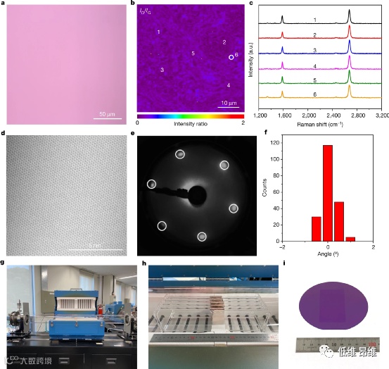 图3. 无折叠石墨烯薄膜的表征。(a&b)无折叠无粘附层石墨烯薄膜的光学图像和ID/IG强度比拉曼成像。(c)不同点的拉曼光谱。(d)无折叠SLG薄膜的原子分辨TEM图像。(e)Cu-Ni(111)箔上无折叠石墨烯薄膜的LEED图案。(f)200个SAED图案取向分布的直方图。(g)6英寸(15厘米)石英管CVD炉系统,用于评估单晶Cu-Ni(111)合金箔上单晶无折叠石墨烯薄膜的可扩展生产。(h)将五片4 cm×7 cm Cu-Ni(111)合金箔挂在石英支架上。(i)在6英寸CVD系统中生长的4 cm×7 cm无折叠单晶石墨烯膜的照片,然后转移到4英寸(10 cm)SiO2/Si晶圆上。