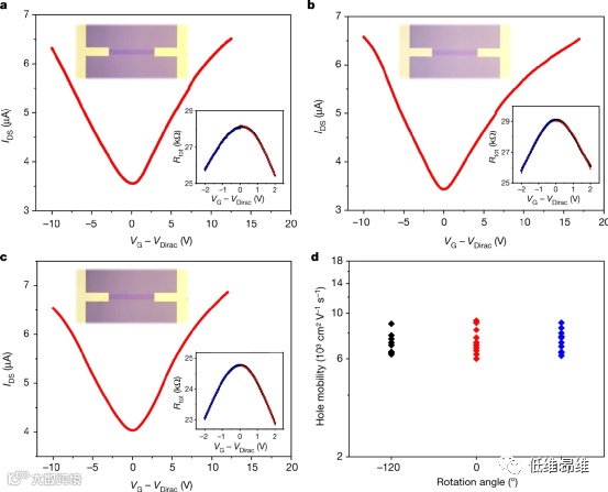 图4. 无折叠石墨烯薄膜的输运特性。(a-c)从三种不同角度制造的GFET测量的典型IDS与VG-VDirac转移特性。(d)平均迁移率值。