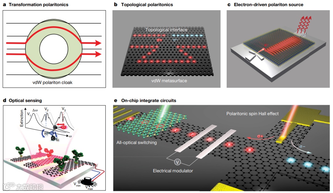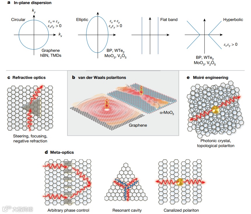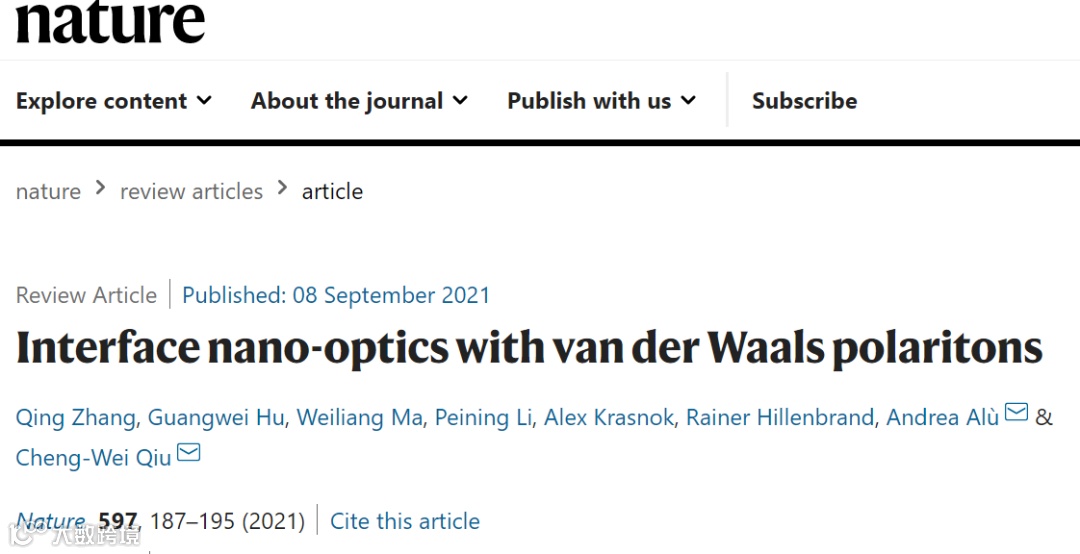 极化激元,是物质和光子的混合激发。近年来,范德华纳米材料中的极化激元(被称为范德华极化激元),从可见光到太赫兹的光谱区域,有望引导纳米级光流。在原子级薄范德瓦尔斯纳米材料的支持下,以极化激元的形式,操纵强光-物质相互作用,有望在先进的纳米光子和光电得以应用。近日,纽约城市大学Andrea Alù,新加坡国立大学仇成伟团队在Nature上发表综述,系统论述了利用界面光学(如折射光学、元光学和莫尔工程),来控制范德瓦尔斯极化激元的最新技术。这种在纳米尺度上,对范德华极化激元子的增强控制,不仅揭示了许多新现象,而且还激发了有价值的应用,包括纳米成像、传感、片上光学电路的新途径。
