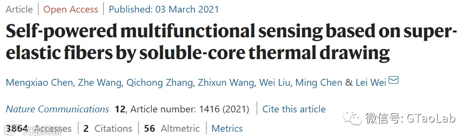 Chen, M., Wang, Z., Zhang, Q. et al. Self-powered multifunctional sensing based on super-elastic fibers by soluble-core thermal drawing. Nat Commun 12, 1416 (2021)
