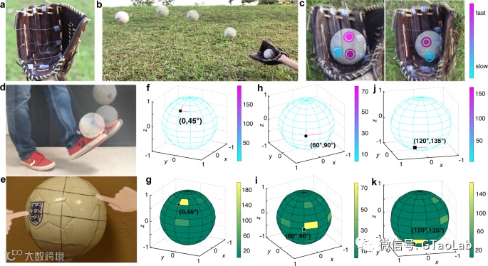 此外,由于该纤维具有超高的柔韧性和拉伸性,可适应各种规则或不规则形状的表面,并能够在突然变形和强烈的外部冲击下保持稳定的传感性能,非常适合监测运动表现和训练。如图2所示,该团队在棒球手套上构建了一个2D纤维网来定位不同接球速度的击球点,在足球上构建一个3D纤维网来执行球坐标的传感功能。