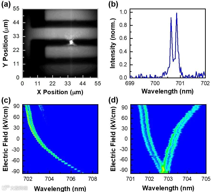 图1 (a) 激光光斑位于两个相邻电极间的光学图像。 (b) 激光光斑处单个钙钛矿纳米晶的垂直偏振荧光双峰发射。(c) 电场强度从90 kV/cm变化到-90 kV/cm时,单个钙钛矿纳米晶荧光峰位的变化情况。(d) 在-90 kV/cm的电场强度下,两个钙钛矿纳米晶的荧光峰位被调节到相同位置。上述实验测量在4 K低温下完成。