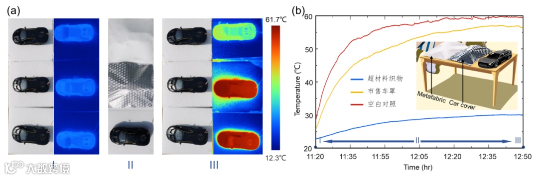 图6 超材料织物与商用市售车罩降温性能对比测试:(a) 模拟汽车实物及红外照片; (b) 制冷性能对比测试曲线图(广州,2020年12月7日)