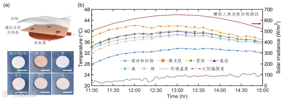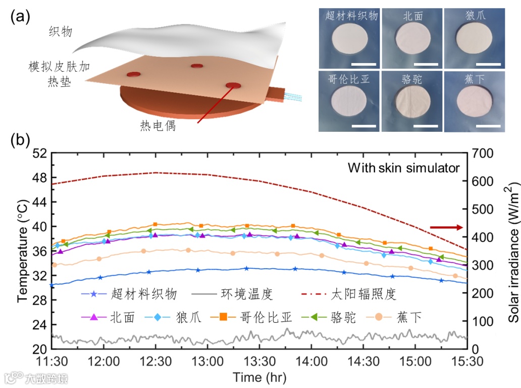 图5 超材料织物与不同品牌防晒衣性能对比测试:(a) 测试装置示意图和样品照片,比例尺10 cm; (b) 超材料织物制冷性能对比测试曲线图(广州,2020年11月30日)