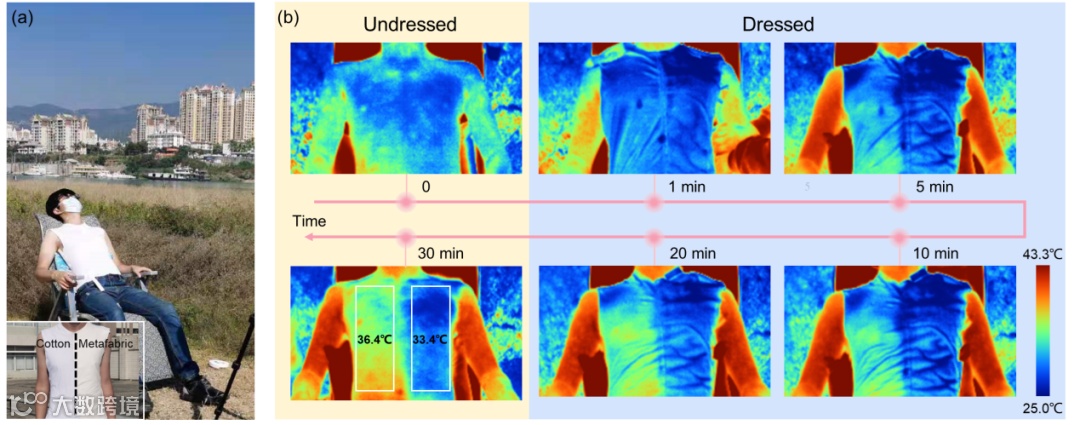 与此同时,研究团队制作一半棉、一半超材料织物的自制背心进行实际人体皮肤测试,相较于商用白色棉织物,其最高降温可超过4 °C(广州,2020年12月7日)。后续研究团队与2020年12月13日在西双版纳再次进行测试(图7 a与视频1),并用红外相机记录全程的温度变化情况,测试结束后脱下背心,志愿者前胸左右两边呈现明显温差(图7 b)。此外,研究团队在考虑人体汗液蒸发的情况下,进行超材料织物与棉的降温测试(天津,2021年5月5日),整个过程中保持连续的水分蒸发,超材料织物下的模拟皮肤相较于棉可低~4 ℃。超材料织物在阳光直射的室外环境下展现了显著降温效果,如同无源轻便地随身空调,给使用者极大的凉爽舒适感。