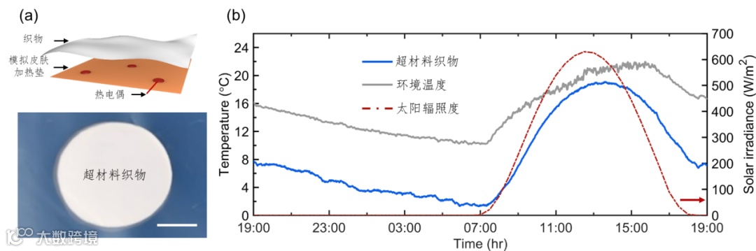图3 超材料织物的降温性能测试:(a) 测试装置示意图和样品照片,比例尺5 cm; (b) 超材料织物24小时连续制冷性能测试曲线图(广州,2020年12月5-6日)