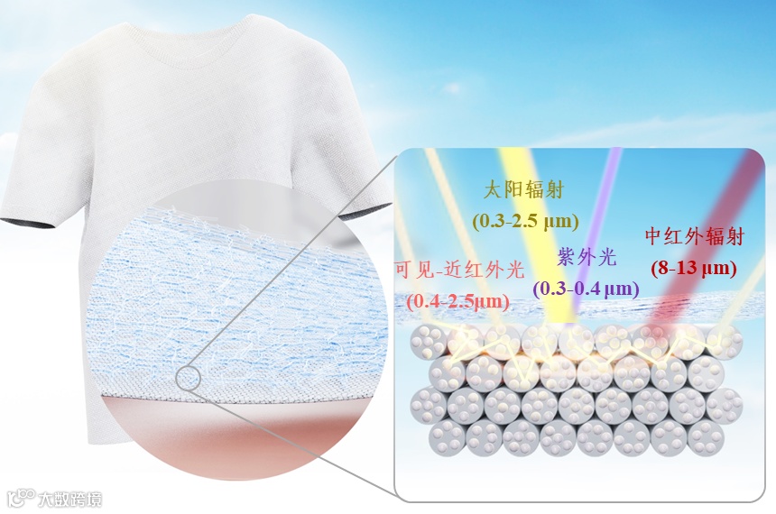 人体热量从皮下组织传导到皮肤,再通过衣物向周围环境散发热量,从而维持动态热平衡和相对稳定的体温。因此,通过衣物进行个人热管理是维持人体个性化热舒适需求的有效方法。但在极端条件下,传统衣物由于没有考虑占主导地位的热辐射作用,导致热调节能力差,且仍不能摆脱耗能、笨重等固有缺陷,因此近年来基于辐射热调节的织物吸引了越来越多学术界和产业界的关注。由于人体红外辐射范围(7-14 μm)与大气透明窗口(8-13 μm)重叠,人体的热辐射可以直接通过大气透明窗口向温度低至3K的外太空进行辐射制冷,从而实现零能耗的降温。所以利用人体所穿戴织物进行辐射制冷可显著提高人体热舒适且不需要任何外部能量输入,是传统耗能热管理技术极具潜力的替代及补充方案。