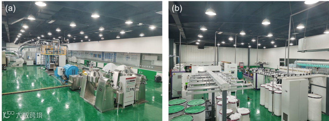 图10 部分实验平台:(a) 化学纤维制造设备照片;(b) 纺纱织造设备照片。