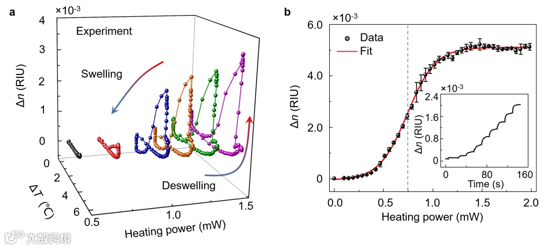 实验中,研究人员利用一束红外激光直接加热微腔内部的PNIPA溶液,当加热光强达到一定阈值时,PNIPA由亲水态消溶胀转变为疏水态。通过实时监测PNIPA在亲水态和疏水态间循环转变过程中微腔模式的动态变化,揭示了溶胀-消溶胀相变循环中的折射率回滞现象(图2a),并通过Flory-Rehner理论分析得到体系相变过程的热耗散。进一步,研究人员通过对溶液热平衡状态测量分析,发现PNIPA的折射率随加热功率的变化呈现玻尔兹曼分布(图2b),并由此计算得到体系的相变阈值。