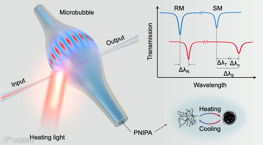 图1 用于相变动力学监测的回音壁微腔传感原理图。插图:PNIPA在亲水态-疏水态间转换的材料微观结构变化与对应的微腔谐振光谱变化。