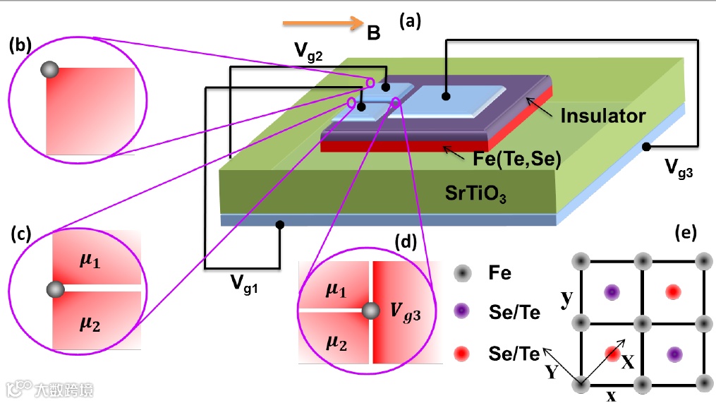 基于单层Fe(Te,Se)实现马约拉纳态的示意图:(b)两个垂直边界的角上;(c)边界上化学势畴壁;(d) 二维体态中的三节。(e) Fe(Te,Se) 晶格结构。