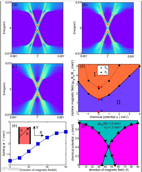 具体来说,在单层Fe(Te,Se)超导边界态中,增加磁场可以实现边界的拓扑相变(下图a-c)。但是,在不同方向的磁场下,相变点是不同的。从磁场-化学势相图(下图d)中可以看出,垂直于边界(BX)和平行于边界(BY)的拓扑转变点不同。这是因为二者的反带能带具有不同角动量,从而发生边界态的各向异性的磁耦合(下图e)。在均匀的面内磁场下,这样相互垂直(或者一定角度)的边界可以处于不同的拓扑态(下图f中的粉色区域),于是在两个边界相遇的角上实现Majorana零能模,也就实现了高阶拓扑超导态。