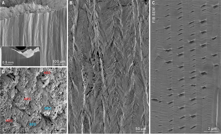 在人造延展性材料中,裂纹等微损伤能够显著影响恶化材料的使用寿命,骨头等(生物)复合材料含有多级微结构,这种微结构对裂纹等损伤具有容忍能力,但是无法实现较高的拉伸塑性。