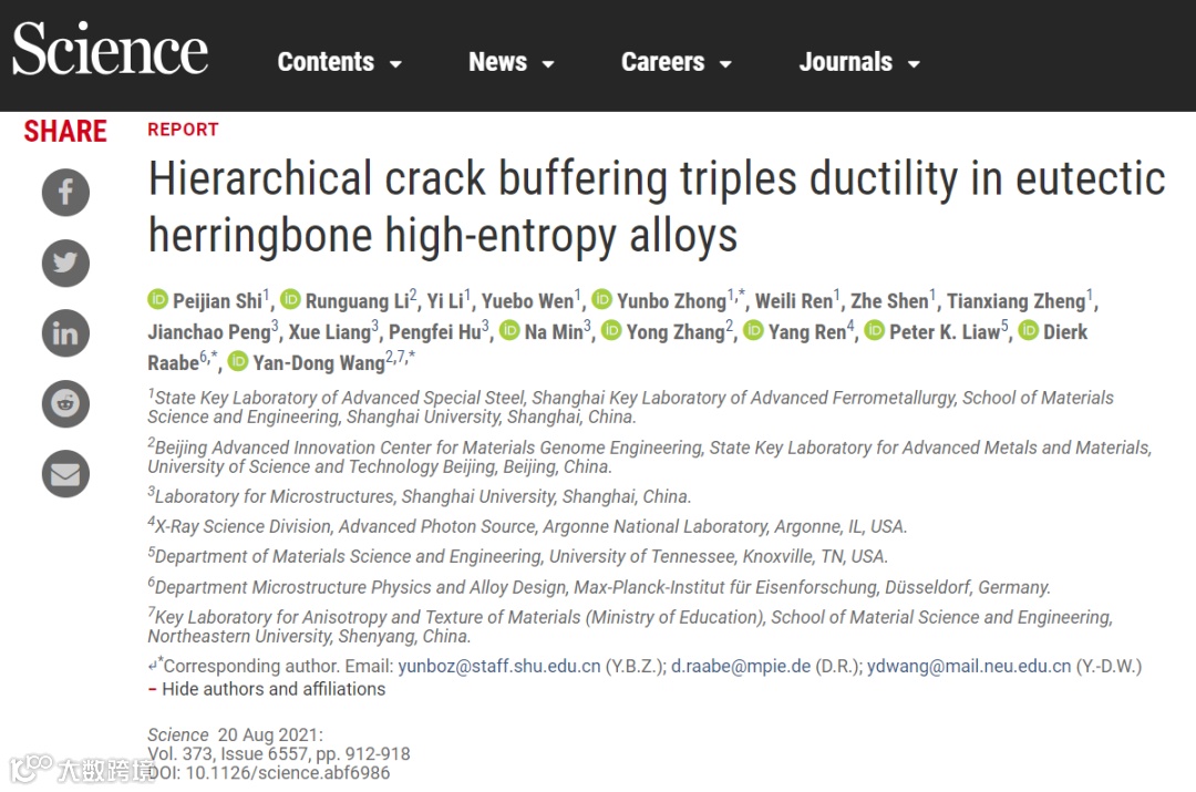 Peijian Shi, et al, Hierarchical crack buffering triples ductility in eutectic herringbone high-entropy alloys, Science 2021, 373, 912-918.