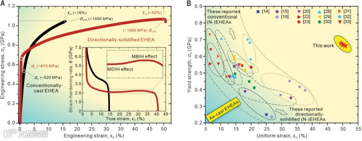 1、发现共晶高熵合金特有的双相层状结构能够触发显著的异质变形诱导的强硬化去改善力学性能。