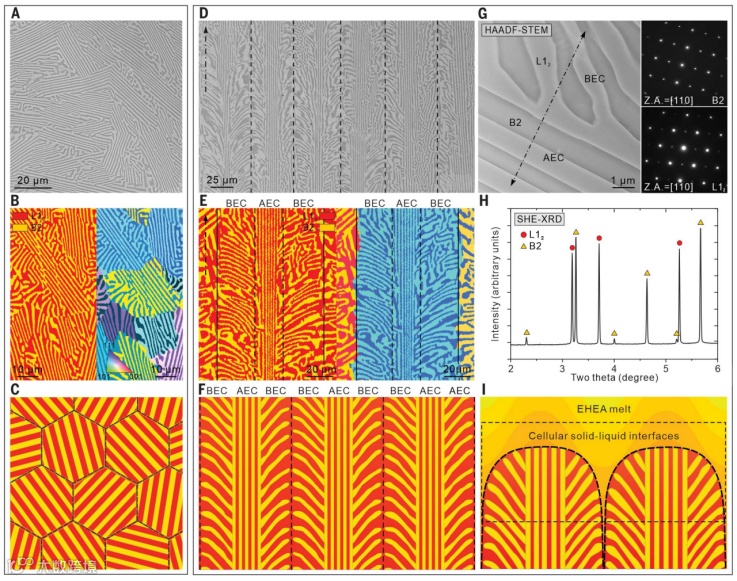 图1. 常规铸造、定向凝固微结构对比 (A-C) 常规铸造微结构表征 (D-I) 定向凝固微结构表征