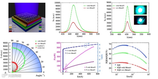 基于在非结构化GaN LED顶部由无序银纳米粒子(NP)组成的超表面IV,将光致发光测量中已制备的商业化GaN-LED器件的输出功率提高1.7倍。使用半球形环氧树脂封装后,外量子效率(EQE)显著提高(从31%到51%),见图2。最重要的是,此项工作通过基于气相簇束沉积的单一程序实现了这个光提取层,大大降低了制造成本和时间。结合大面积制造的可扩展性,这种具有成本效益的无序超表面代表了一种有前途的方法,有望弥合照明市场中高效实验室演示和工业生产之间的差距。