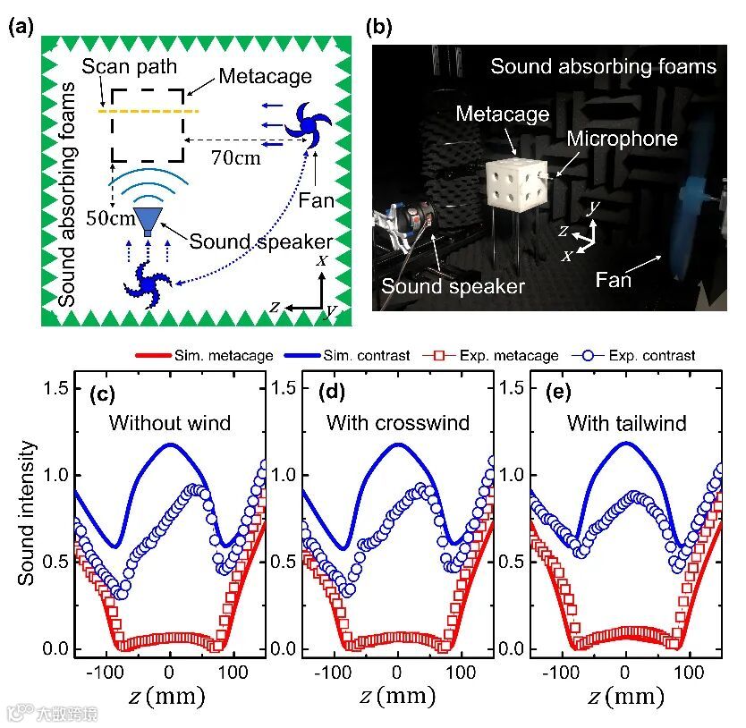 图3 (a)声学实验的示意图。(b)声学实验的照片。(c),(d),(e)分别表示了无风,侧风,顺风等不同气流场景下,不同空间位置的测得声强图。笼子内部范围是(-70mm,70mm)。
