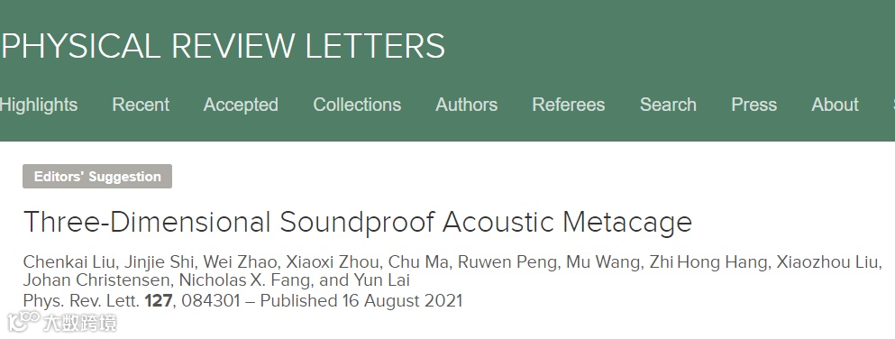 该研究成果近期以“Three-Dimensional Soundproof Acoustic Metacage”为题发表在了Physical Review Letters上(Phys. Rev. Lett. 127, 084301 (2021)),并被选为编辑推荐(Editor’s Suggestion)。