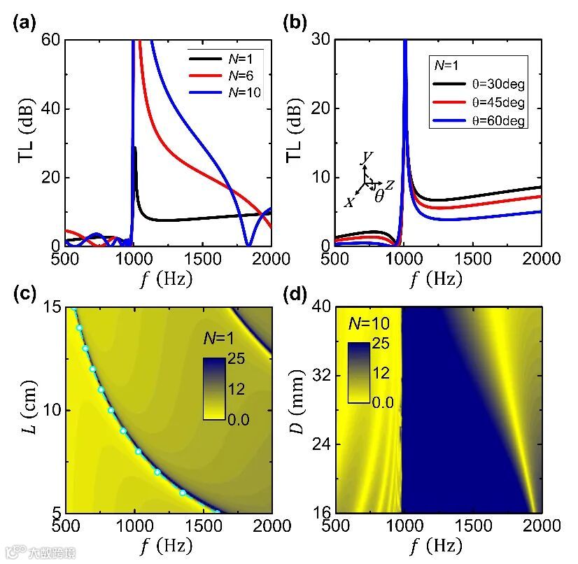 图2 (a)不同面板层数的透射损耗频谱图。(b)不同入射角度的透射损耗频谱图。(c)透射损耗随频率和管道长度变化的轮廓图。(d)透射损耗随频率和孔洞直径变化的轮廓图。