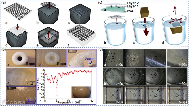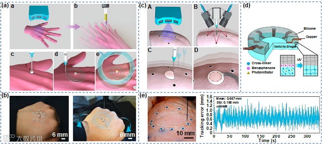 直接印刷技术解决了转印术由于需要多个转印步骤以及制造过程中发生不可避免的形变而导致的效率有限问题。图6,7,8展示了五轴印刷系统,实时电动直接印刷和立体光刻造型。