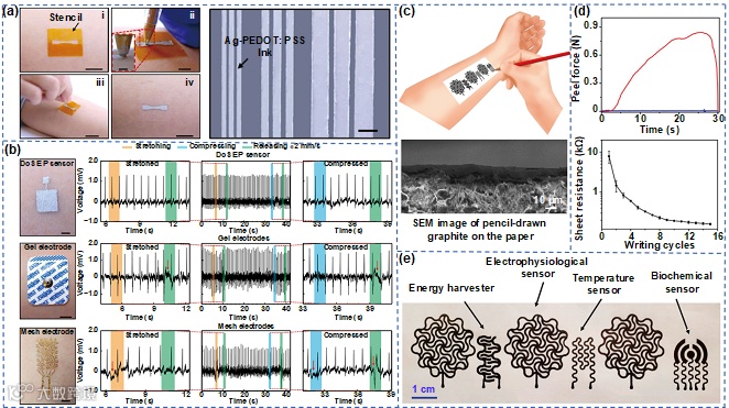 除转印术和直接印刷技术,还有其他可适用于复杂曲面的保形器件制造方法,比如喷涂镀膜和画写式皮肤电子产品。这些新颖的保形制造技术可以增强电子器件与目标界面的粘合力,并且易于操作。图9展示了运用书写工具如铅笔和纸完成制造的皮肤电子设备。图10展示了使用新型烧结辅助薄层在皮肤上直接制造的传感器。