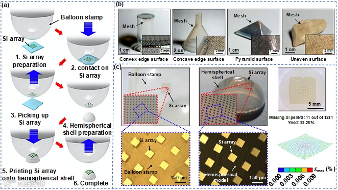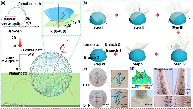 各种制造技术,例如接触印刷,纳米压印术和电子束曝光,已经被广泛应用于在2D平面基底上制造传感器和电子设备。但是由于平面制造的局限性,这些固有平面制造技术并不能直接应用在3D曲面上制造保形器件。科研人员们探索了各种可拉伸结构和新型纳米材料及其复合材料来解决这一挑战。在保形电子器件的制造过程中,常用的可拉伸结构包括波浪形几何形状,应变隔离,丝状蛇纹石形或网状设计,螺旋线圈和折纸式样。通过结合可拉伸结构与先进的转印技术,平面制造方法可以实现在复杂表面上的器件制造。广泛使用的纳米材料包括金属纳米线,碳纳米管,石墨烯,液态金属合金和有机薄膜。通过结合功能性纳米材料,各种直接印刷技术和书写方法相继提出,可用于复杂曲面上保形电子器件的制造。