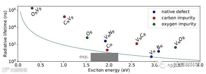 Fig. 2 Radiative lifetime and energy of the lowest bright exciton of candidate defect SPEs in hBN from GW-BSE calculations.