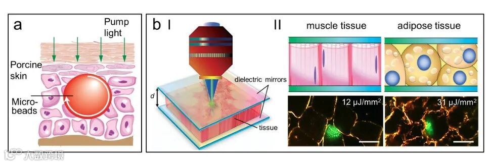 除了生物细胞,多细胞结构的活体组织同样可以采用上述类似的技术构建生物激光器(也即组织激光器)。例如,通过将荧光标记的聚苯乙烯微球植入哺乳动物活组织样本中,分别实现了眼角膜,血液和皮肤表面下200微米深处的激光发射(图3a)。另一种较为典型的组织激光器是将组织样本置于F-P谐振腔中构建的“激光发射显微镜(LEM)”(图3b)。与荧光显微镜相比,激光发射显微镜具有窄线宽(发射光谱 < 0.1nm),低阈值和高信噪比(信噪比>50)等优势,从而实现超灵敏检测,具有出色的图像对比度和更高的光谱/空间分辨率。另外,通过对组织细胞的DNA和蛋白进行特异性荧光标记,可实现多重激光,可同时检测多个靶点。