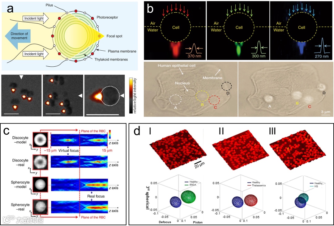光学透镜是进行光场调制的重要光学器件,具有汇聚或发散光束的功能。令人意想不到的是,许多天然的生物活细胞可作为生物微透镜在生物系统中发挥聚焦光束的功能。例如,研究发现蓝藻细菌的趋光性很可能源于其透镜效应。球形的蓝藻细菌可作为微透镜将光束聚焦到细胞膜附近,膜上的光感受器感受到光刺激后激活鞭毛,拖动细胞向光源方向移动(图5a)。蓝藻很可能是地球上最小并且最古老的细胞微透镜。其它活细胞,如酵母细胞、红细胞等,同样可以作为生物微透镜发挥光调制的功能。