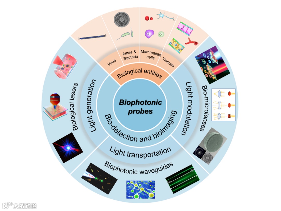 该综述系统总结了基于病毒、细胞、活体组织等不同生命体的生物光子探针从光的产生、到光的传输与光的调制的不同光学功能,探讨了这些生物光子探针作为生物激光器、生物光波导、生物微透镜等光子器件在生物探测与成像等领域的应用(图1)。在此基础上,展望了生物光子探针在生物光子学与生物医学领域所面临的机遇与挑战。