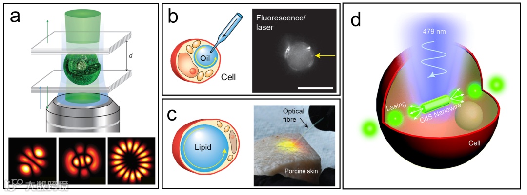 这种回音壁模式光学微腔可以是混合了荧光染料的脂滴(图2b),亦或是具有高折射率的回音壁微球腔,如荧光掺杂的聚苯乙烯微球(图2c)。然而,虽然这类回音壁模式光学微腔可实现高灵敏度的细胞内激光输出,但其较大的尺寸(微米级)很可能会对细胞的生理功能产生不可忽视的影响。解决这一问题的办法是可将纳米级的激光器(如CdS半导体纳米线或者金纳米线等离激元激光器)嵌入细胞质中(图2d),可在不影响细胞健康及正常生理功能的情况下实现活细胞实时监测及成像。