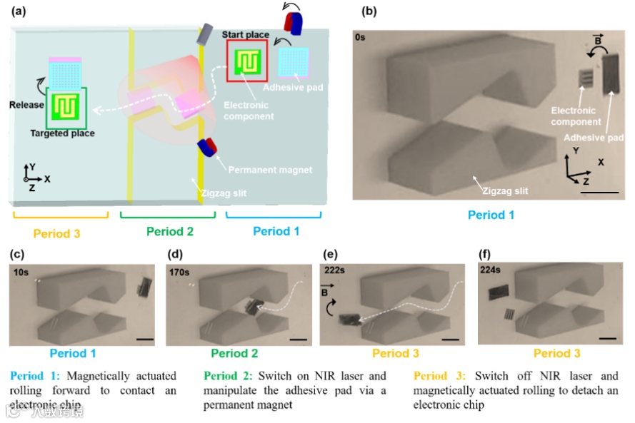 精细物体的远程递送。通过外加磁场,该光磁双刺激响应的黏附垫可在狭隘空间内对脆弱的电子芯片进行安全可靠地定向运输,在电子器件装配等领域具有重要的应用前景。
