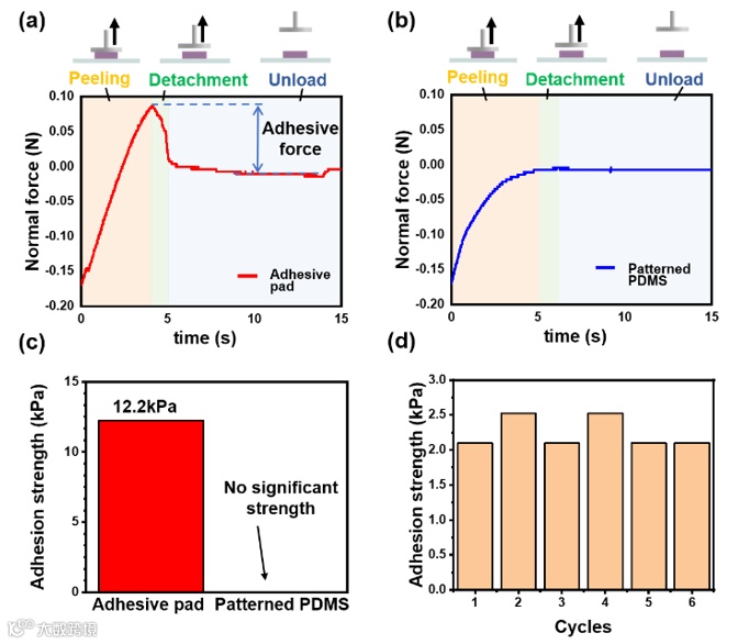 图3 黏附性能表征:(a)黏附垫的黏附力测试,(b)图案化弹性体基底黏附力测试,(c)黏附垫与图案化弹性体基底的黏附强度对比,(d)黏附垫重复性测试