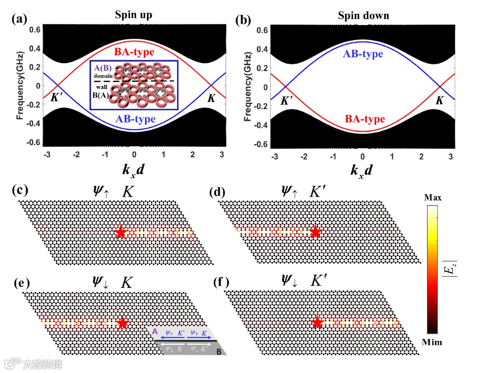 图2 上自旋(a)和下自旋(b)在AB-类型(蓝线)和BA-类型(红线)畴壁的能带结构。阴影区域对应于体态。(c)-(f)拓扑谷边界态在AB-类型畴壁的单向传输。