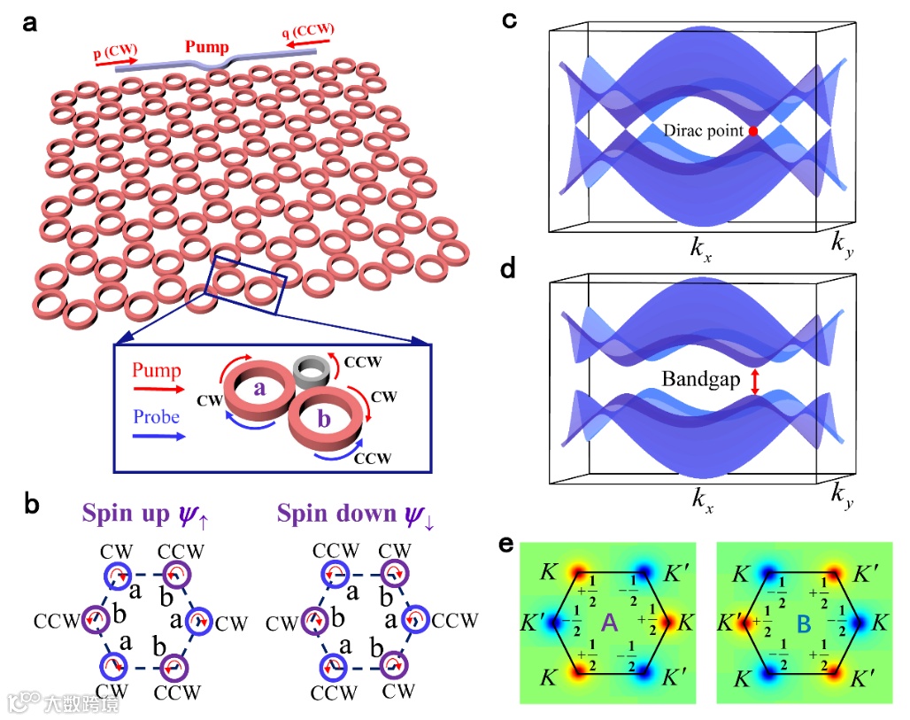 图1 (a)二维蜂窝状阵列环形谐振器。(b)上自旋和下自旋示意图。(c)无泵浦情形下蜂窝状晶格的能带结构。(d)自旋-谷霍尔光子拓扑绝缘体的能带结构。(e)上自旋在类型-A和类型-B的能谷附近的贝里曲率以及谷陈数。