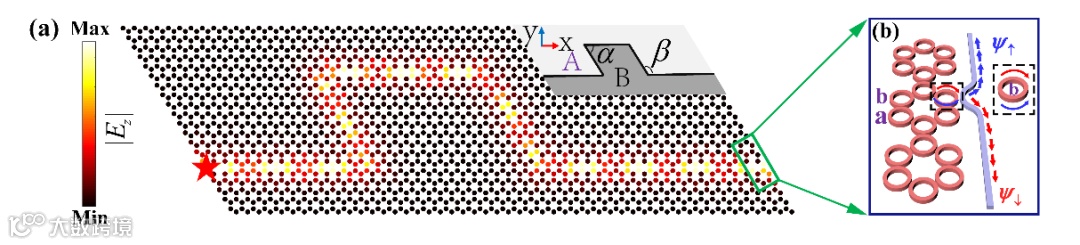 图3 (a)拓扑边界态在锯齿形畴壁的传输。(b)利用波导模式和环形谐振器的自旋轨道耦合实现两种自旋的空间分离。