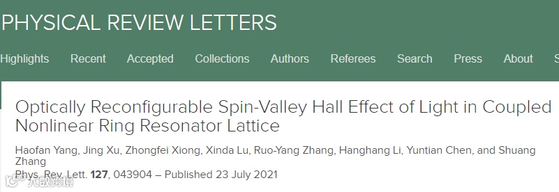 近日,华中科技大学和香港大学的研究人员提出了一种实现光学自旋-谷霍尔效应的实验可行方案。相关研究成果以《Optically reconfigurable spin-valley Hall effect of light in coupled nonlinear ring resonator lattice》为题,于2021年7月23日发表于《物理评论快报》(Physical Review Letters)上。华中科技大学光学与电子信息学院博士生阳浩帆为论文第一作者,华中科技大学徐竞教授,陈云天副教授和香港大学张霜教授为论文的共同通信作者。这一工作的合作者为华中科技大学博士生熊仲非,硕士生鲁欣达,本科生李行航以及香港科技大学张若洋博士。华中科技大学为第一通讯单位。该工作得到了国家重点研发计划,国家自然科学基金以及地平线2020计划的支持。