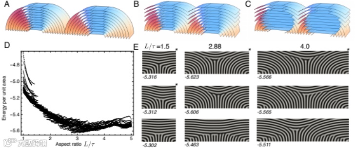 层列型液晶还有可由几何受阻引起的另一种典型缺陷结构——“油性条纹”结构,它不同于前面的焦锥结构(在缺陷处改变了整个层面的弯曲度),其在平行于双基片方向上表现出层状的周期性同时在与基片垂直的方向上具有层状的空间一致性。为此,该情形用所提出的数学模型来研究、模拟油性条纹的形成并通过改变区域的长宽比来对比可产生最低能量的薄片比例,从而可与相关物理实验结果进行比较。同样地,在四边形的上下边界的方向矩阵 Q 施加狄利克雷条件从而使得上边界粒子呈垂直排列以及下边界粒子呈水平排列。事实上,该情景设置下的大部分数值实验结果与由 Michel 等人 [2] 所提出的结构具有高度相似性,这再一次验证了此模型的有效性。另一方面,此类数值实验还发现了此情形中其他的结构可能性(比如图 3E 的最后一行),其中垂直排列的层状结构占据相当一部分比例。这促进了对于油性条状结构的更深层次理解。