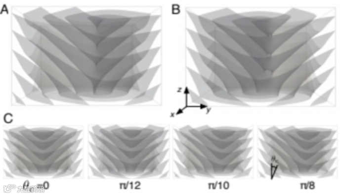 图2: 在带有不同倾斜角 θc 边界条件下的焦锥结构。A 单螺旋位错结构解θc = π/12)。B 双螺旋位错结构解(θc = π/12)。C 不同 θc 取值下的稳定解。关于 θc = π/12 取值下所展示的三个解中,焦锥解具有最低能量值而双螺旋位错结构解具有最高能量。