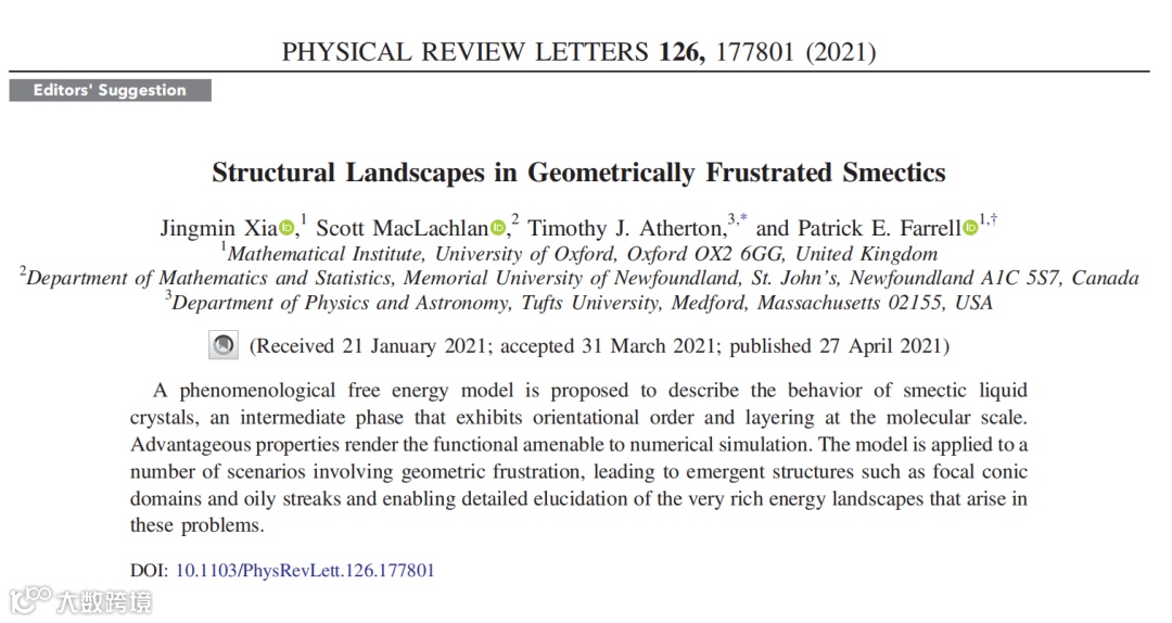 文章信息:该研究成果以“Structural Landscapes in Geometrically Frustrated Smectics”为题在线发表在《物理评论快报》(Physics Review Letters),并被编辑部选为“编辑推荐文章”。