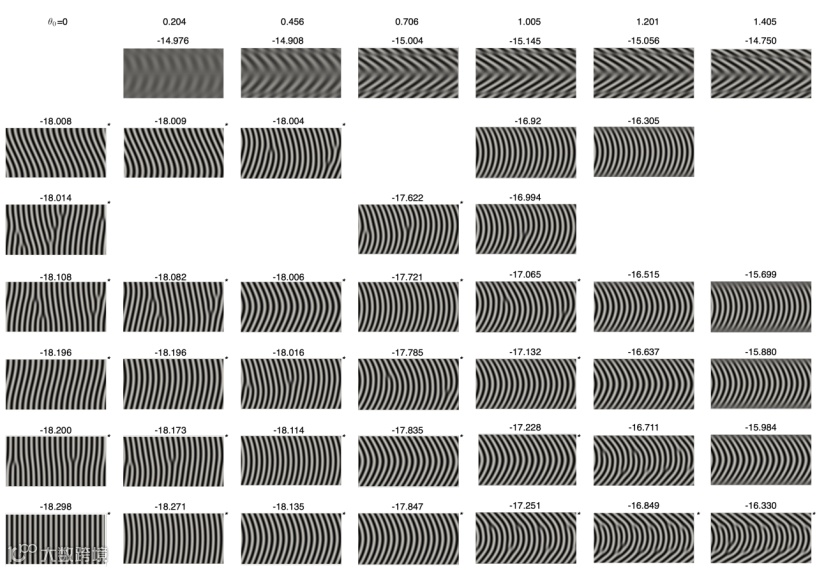 数值实验结果显示:当 θ0 = 0(即无外界施加弯曲形变条件),该液晶呈现出“书架”状几何形式(可见图 1 中最后一行的第一张图);而随着 θ0 变大,施加于液晶上的弯曲形变将增加且引出了三种反应状况:液晶可将形变作用均匀分散在垂直方向上(如图 1 中最后一行的第二张图);将弯曲形变集中于中心区域(如图 1 中最后一行的第三四张图);或者引入边缘位错来减少更多弹性形变的影响(如图 1 中最后一行的后三张图)。