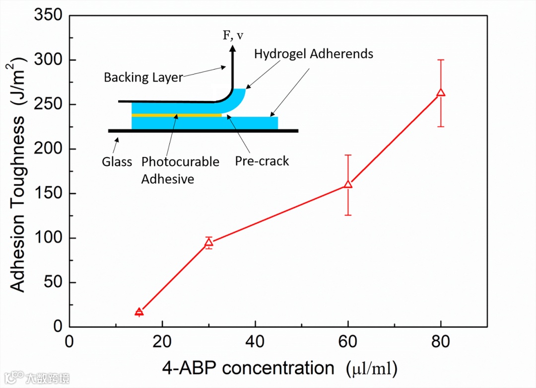 研究人员进一步探究了PGPCs的应用。他们首先使用PGPCs粘接两个湿的可渗透的水凝胶材料。水凝胶和水凝胶之间的粘接韧性由90度剥离实验表征(图3)。粘接韧性随PGPCs中4-ABP含量的增加而增加。作为对比,PGPCs水凝胶的韧性随4-ABP含量的增加而减小(图2D)。注意到,尽管裂纹在界面扩展,粘接韧性比被粘接物的断裂韧性要高。这一现象可以做如下理解。当4-ABP的含量增加时,单位界面面积中粘接点的数目随之增加。剥离时,粘接层和被粘接物均被高度拉伸。裂纹扩展时,存储于两者内的弹性能被释放出来。这里的粘接韧性可以达到几百J m-2。作为对比,由纳米二氧化硅颗粒导致的粘接韧性在10 J m-2这一量级。如果在被粘接物中引入耗散机制,那么粘接韧性可以达到103 J m-2 这一量级。